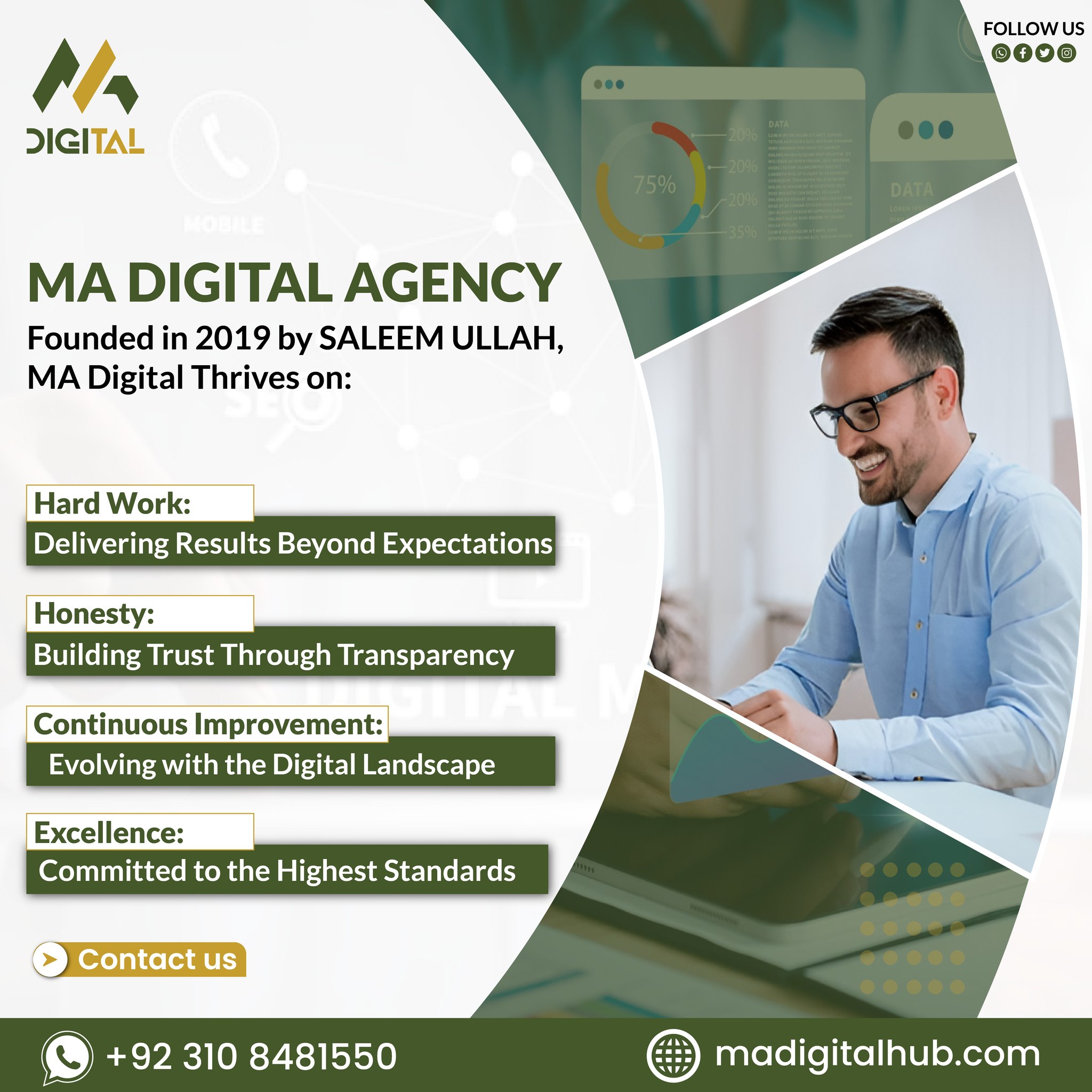 MA Digital Agency was founded by Saleem Ullah, who began his journey as a freelancer during his university years while studying Software Engineering. During that time, he worked on various projects and consistently delivered high-quality results to his clients. Through his dedication, technical expertise, and professional approach, more businesses started approaching him for reliable digital marketing and web solutions.